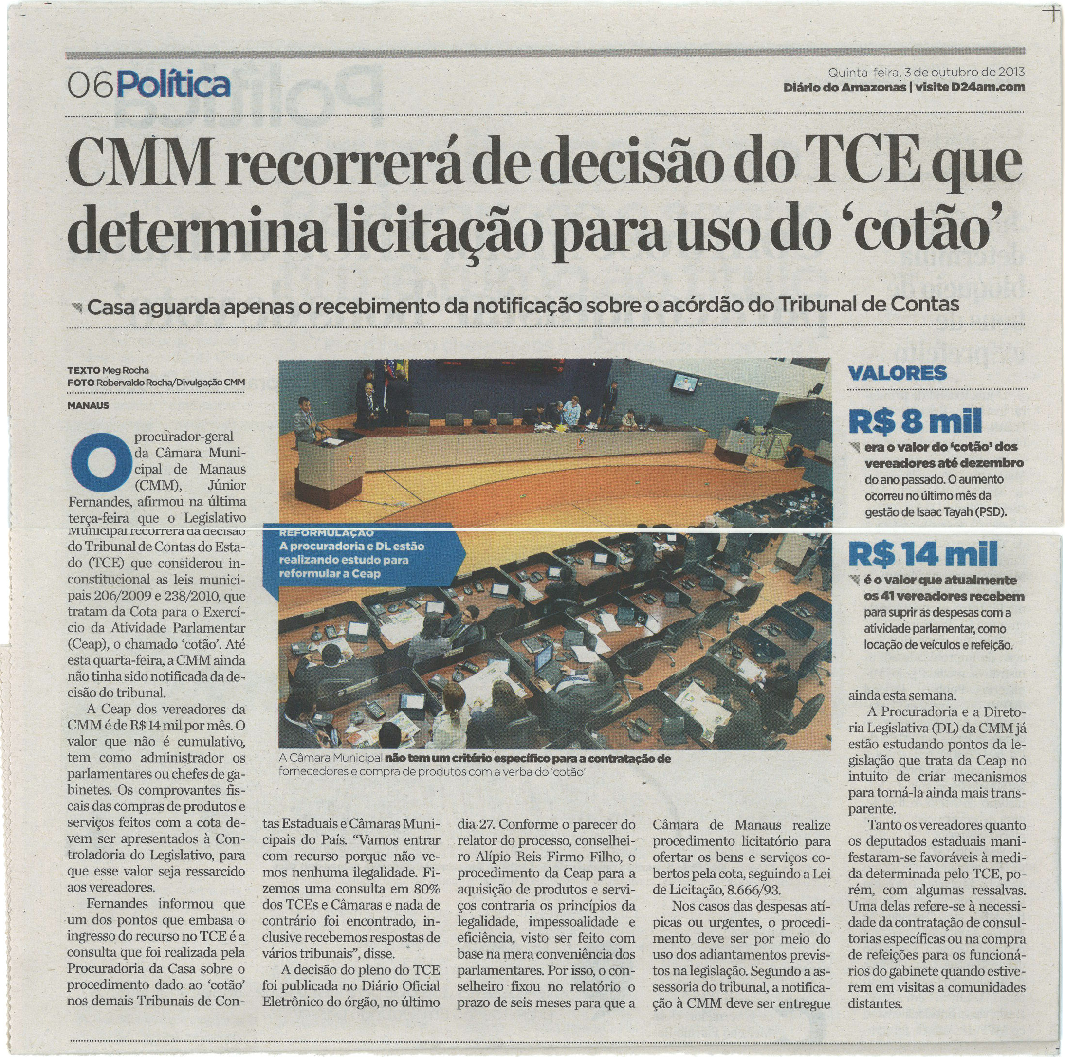 3/10/13 Diário do Amazonas CMM recorrerá de decisão do TCE que determina licitação para uso do 'cotão'