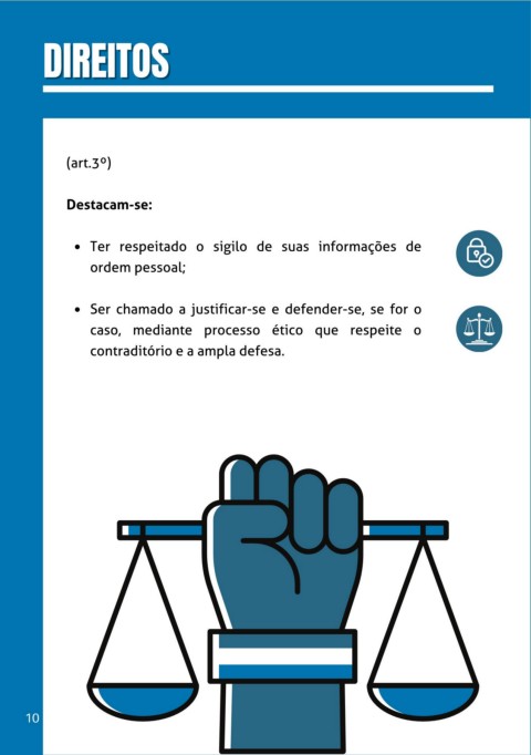 DIREITOS DIREITOS (art.3º) Destacam-se: Ter respeitado o sigilo de suas informações de ordem pessoal; Ser chamado a justificar-se e defender-se, se for o caso, mediante processo ético que respeite o contraditório e a ampla defesa. 10