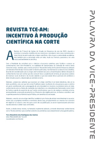 Com este periódico, produzido pela Vice-Presidência do TCE-AM em conjunto com a Escola de Contas conhecimento, esta Vice-Presidente, na qualidade de coordenadora da comissão de revista desta