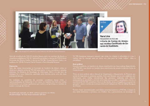 e que atesta a atuação das Cortes de Contas Brasileiras e suas conformidades com presidente Yara Lins dos Santos, durante a entrega do certificado. Mais duas boas práticas identificadas na auditoria foram apresentadas pela da Universidade de São Paulo (USP), para participar do processo de certificação, analisando